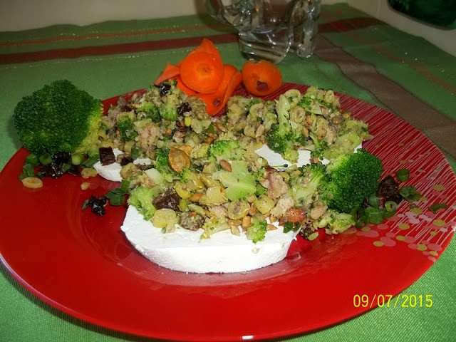 -puszka sardynek w oleju-1/2 średniego brokuła-ok. 10 dkg fasolki szparagowej-szczypior-kilka suszonych pomidorów-po garści pestek słonecznika i dyni-sól i pieprz do smaku-biały ser