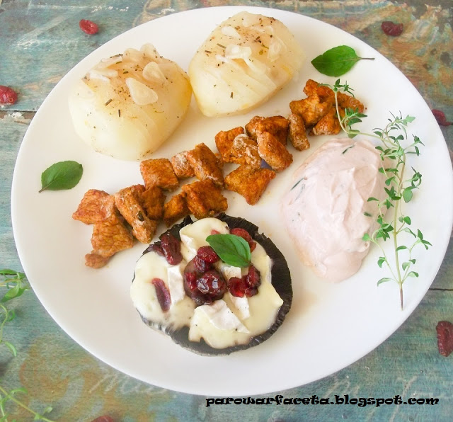 2 plastry schabu 150g serka twarogowego Almette Fruit z wiśnią i żurawiną 2 młode ziemniaki 3 plastry sera camembert 2 łyżki