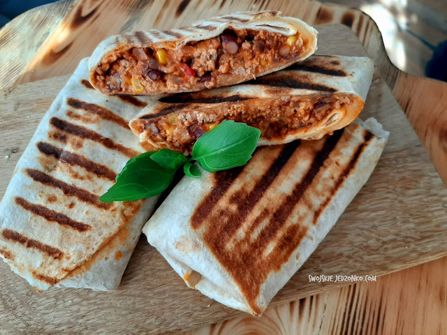Pyszne koperty z tortilli z mielonym mięsem, czerwoną fasolą i kukurydzą, w…