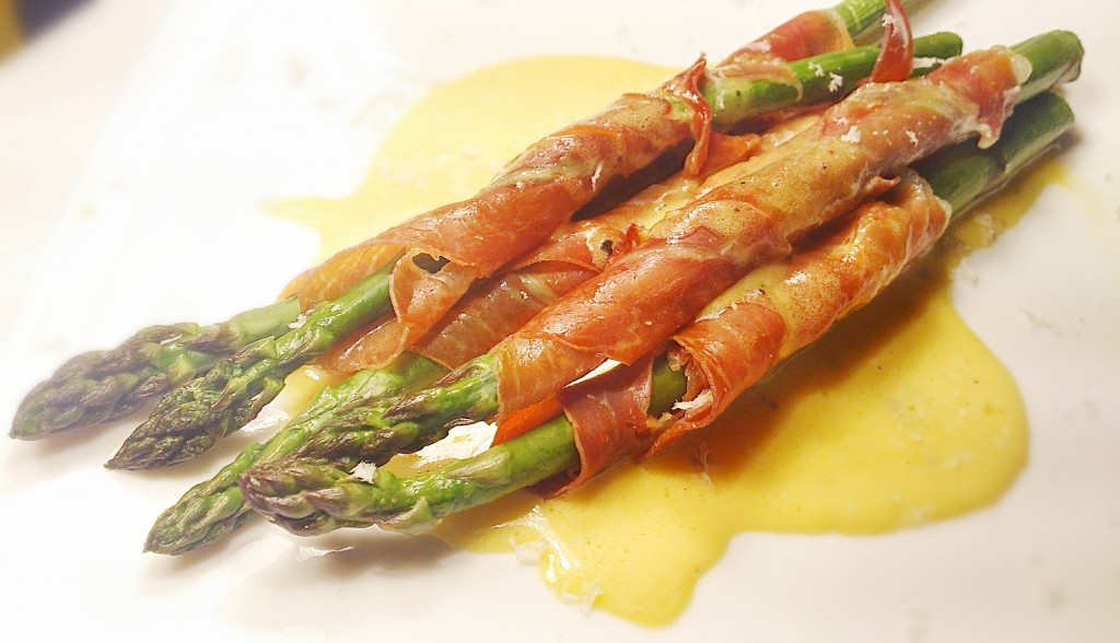 Zielone szparagi zapiekane z szynką parmeńską i do tego z klasycznym sosem holenderskim. Delikatne, chrupkie szparagi lekko podpieczone z grubo mielonym pieprzem, zawinięte w jedną z najlepszym szynek świata i polane aksamitnym sosem holenderskim (oczywiście ubijanym ręcznie, bez żadnych fiksów!). Zielone szparagi w szynce z sosem holenderskim to coroczny hit