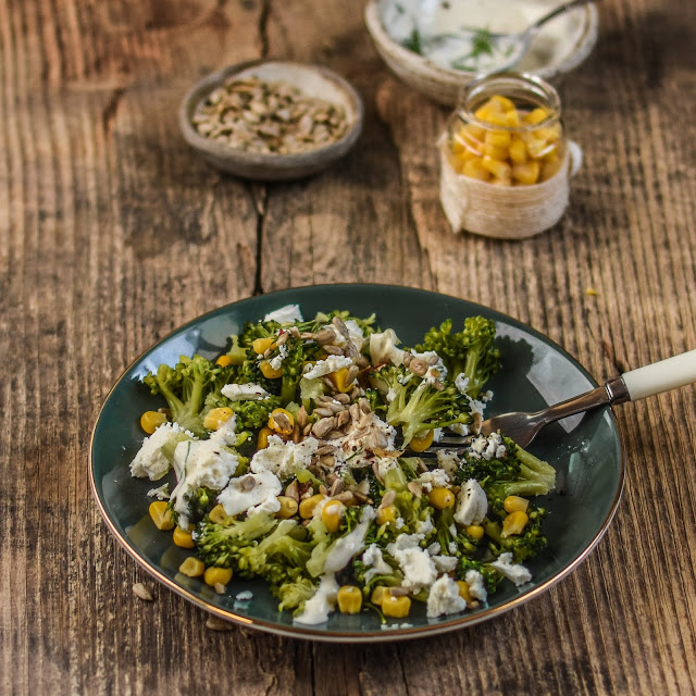 Sałatka z brokułem, serem feta, kukurydzą i prażonym słonecznikiem. Idealna na lunch…