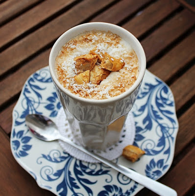 Pyszny orzeżwiający przepis na mrożoną słodką kawę o rozkosznym smaku mango z miłą chrupiącą niespodzianką! Do zrobienia kawy można wykorzystac mleko sojowe lub każde inne – krowie, kozie, owsiane, migdałowe – tak jak kto lubi. Oprócz blendowanego świeżego mango, będącego składnikiem kawki, bardzo fajnym dodatkiem jest mango puffingowane, którym