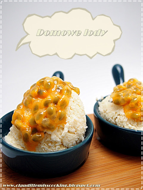 PRZYGOTOWANIE:Składniki przełożyć do miski. Dokładnie zmiksować blenderem lub w mikserze. Przełożyć do plastikowego naczynia i zamrozić. No u mnie mroziło się 4 godziny. Lody po nałożeniu do miseczek udekorowałam miąższem z marakui. 🙂
