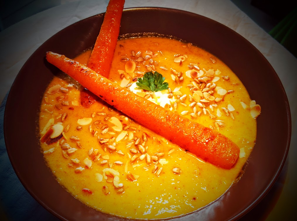 Zupa, a właściwie krem z pieczonej marchewki. Najlepiej młodej. Wtedy jest najsmaczniejsza. W tej wersji jest całkiem egzotyczna, ale ponieważ młoda marchewka jest latem, nie jest rozgrzewająca, choć bez problemu można ją zmodyfikować do jesienno-zimowej wersji. Zupa krem z pieczonej marchewki jest aksamitna, lekko słodka od mleka kokosowego, pikantna od