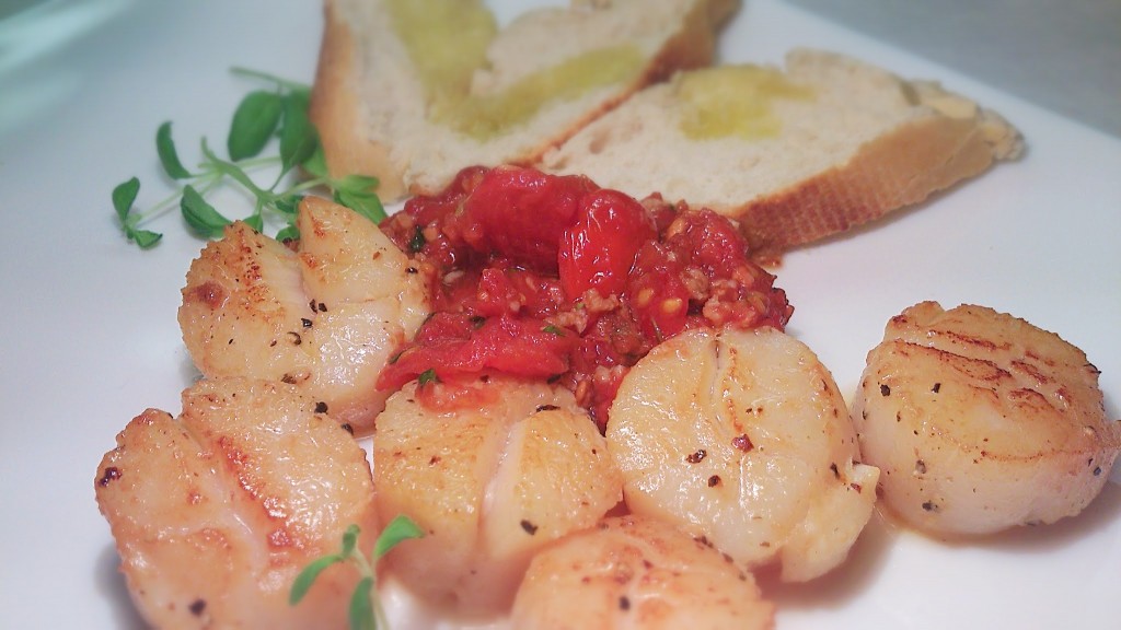 Przegrzebki z pomidorową salsą. Czyli małże św. Jakuba, albo scallopsy z salsą. Salsa to dość gęsty pikantny sos ze zmiksowanych lub drobno pociętych warzyw albo owoców. Delikatność przegrzebków jest przełamana pikantną salsą pomidorową (oczywiście ze świeżych pomidorów).