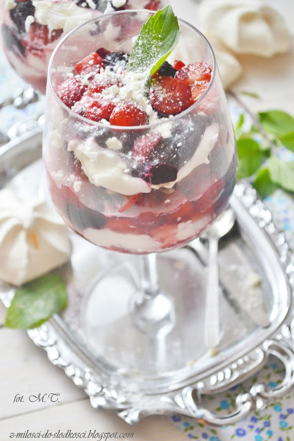 Deser jest tak prosty, że zastanawiałam się czy w ogóle publikować go na blogu:)) Wiem jednak, że to bardzo popularny deser, obecny na prawie wszystkich blogach. Moja wersja zawiera świeże truskawki oraz frużelinę jagodową, która nadała całości niepowtarzalnego smaku!