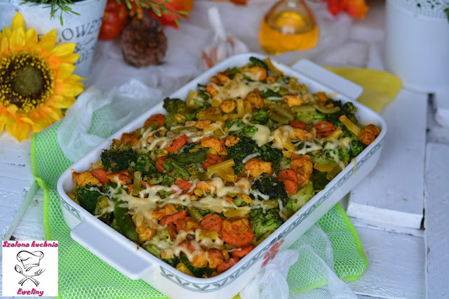 Makaronowa zapiekanka z kurczakiem, bukietem warzyw i nutą czosnku