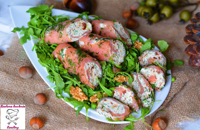 Cygaretki z łososia nadziewane delikatnym serkiem o chrzanowym akcencie, z dużą ilością…
