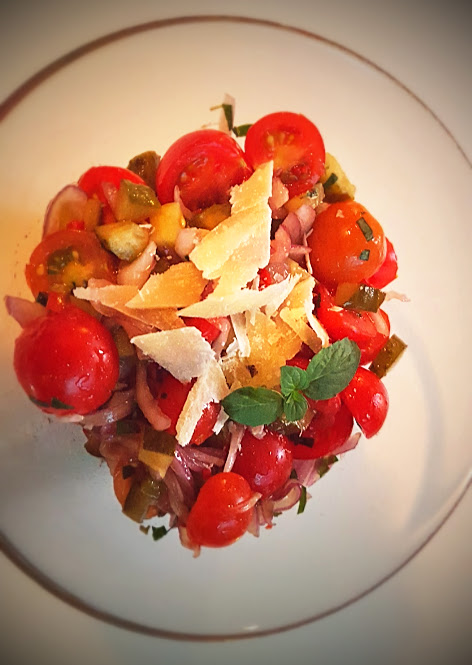 Słodko-kwaśna sałatka z pomidorków, ogórka i chili. Lekko słodkawa marynata miesza się z kwaskowym ogórkiem konserwowym, a wszystko przełamane ostrością chili. Niezwykle lekka i orzeźwiająca sałatka. W sam raz na lato, zwłaszcza do mięs z grilla.