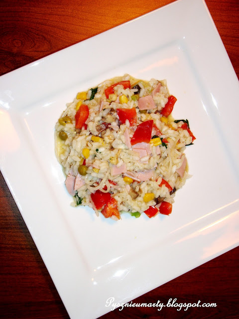szklanka ryżu do risotto,2 kostki rosołowe,woda – zalecam filtrowaną :-)ulubione warzywa, ja użyłam: kukurydzy, groszku, papryki, selera, pietruszki,kilka sztuk pieczarek,szynka wg upodobania,przyprawy,cebula i czosnek,kilka kropel oliwy.