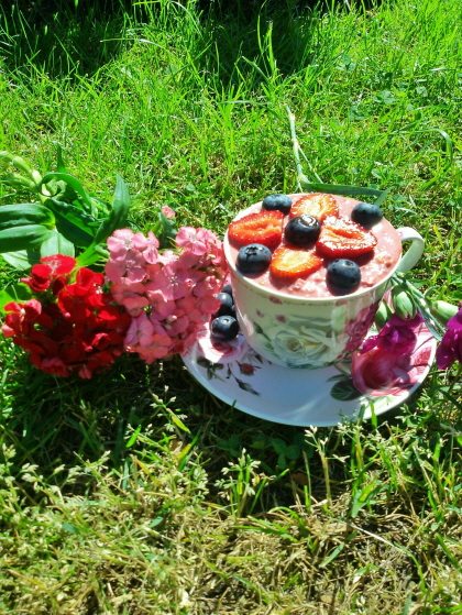 Owsianka malinowa z jogurtem. Podana z borówkami i truskawkami