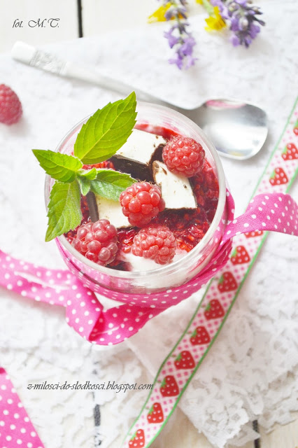 Składniki na 3 porcje: 6 łyżek jogurtu malinowego, 200 g malin, 100g truskawek, 6 sztuk ptasiego mleczka.