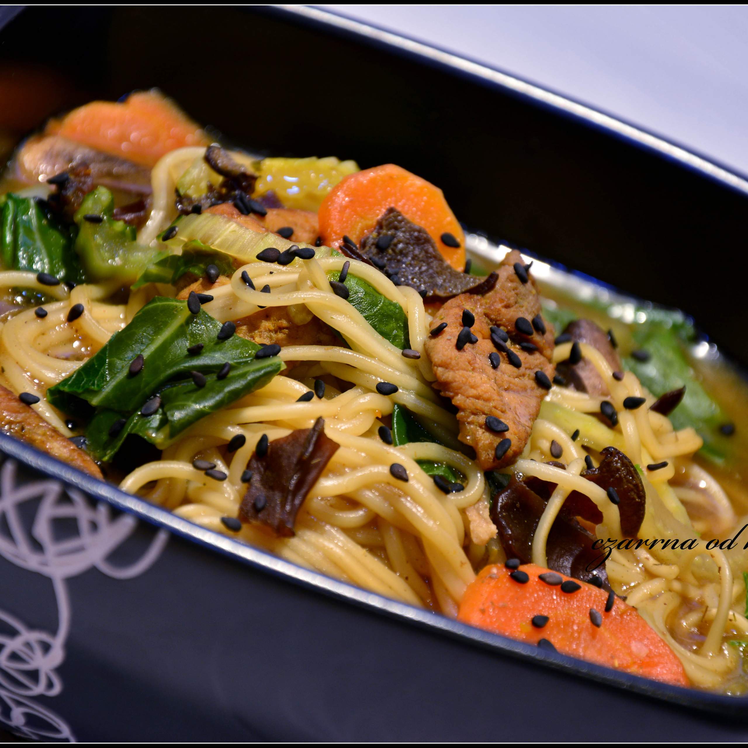 Składniki: 30 dkg schabu 1 kapusta pak choi 10 dkg pieczarek 1…