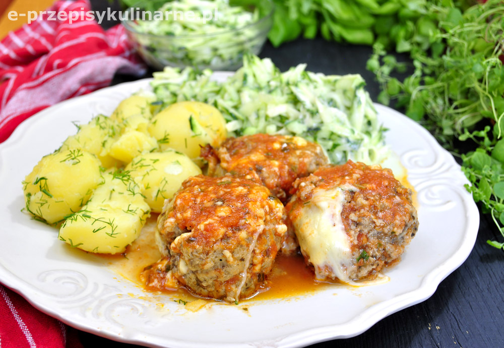 Pyszna odskocznia od tradycyjnych mielonych. Kotlety z pieczarkami pieczone w pysznym sosie pomidorowym i posypane żółtym serem.