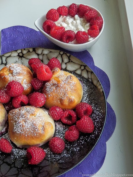 Śliwki smażone na maśle ghee i cukrze kokosowym owinięte kołderką z migdałowego ciasta drożdżowego podane z serkiem wiejskim, malinami i cukrem pudrem