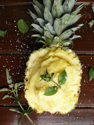 1/2 ananasa1/2 niedużego melona1 mango2 łyżki wiórków kokosowychmiód (opcjonalnie)Miąższ owoców pokój w niedużą kostkę i zamroź. Zamrożone owoce zmiksuj na gładko razem z wiórkami kokosowymi. Nie trzeba słodzić jeżeli wybierzesz dojrzałe owoce. Jeżeli jednak sorbet