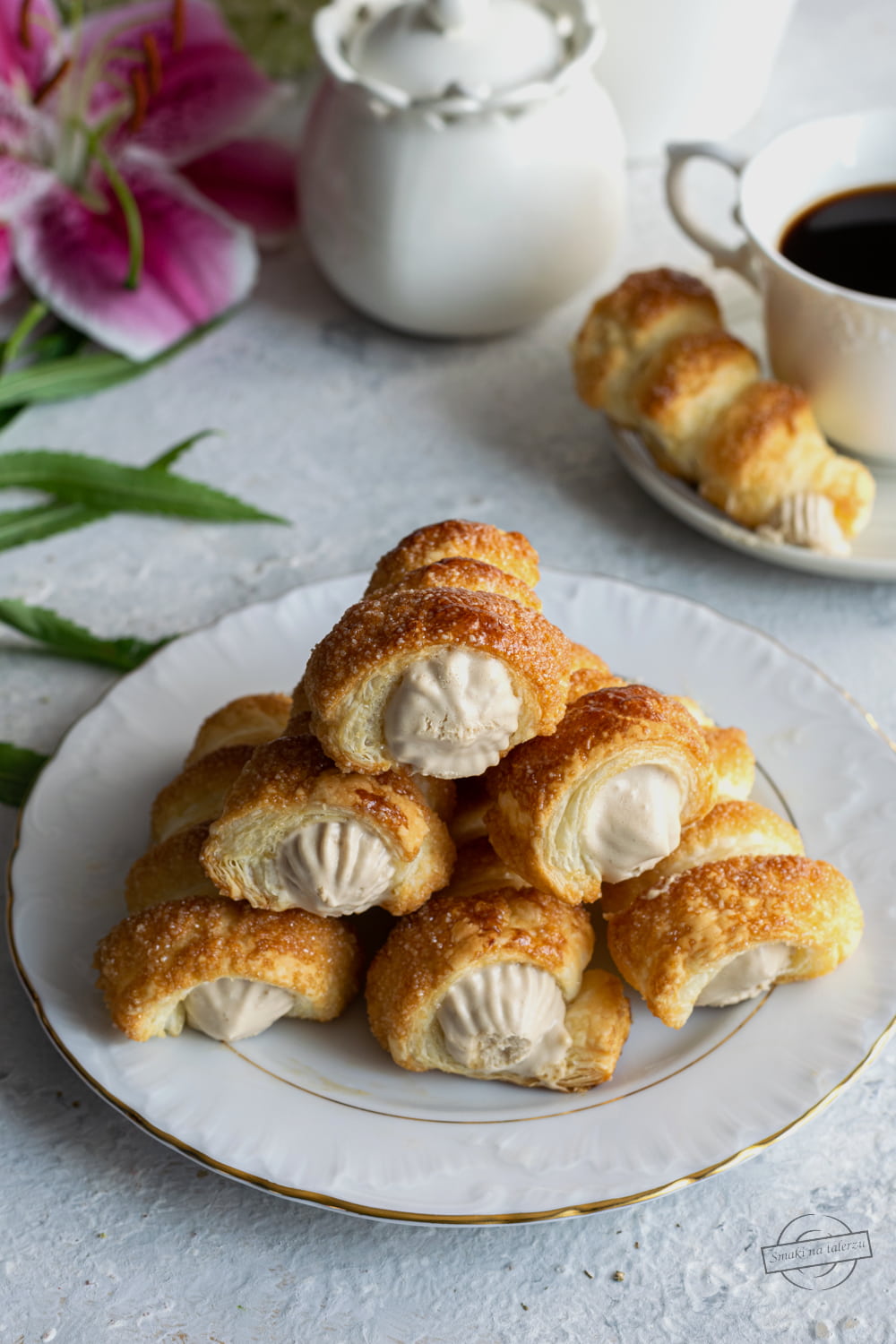Prosty, a jednocześnie wspaniały deser z ciasta francuskiego. Obtoczenie rurek przed pieczeniem…