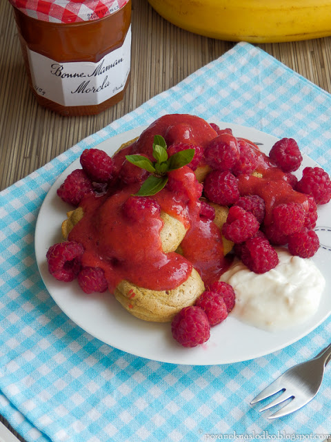 Migdałowo-morelowe donuty z ciecierzycy podane z malinami, musem z poziomek i jogurtem naturalnym