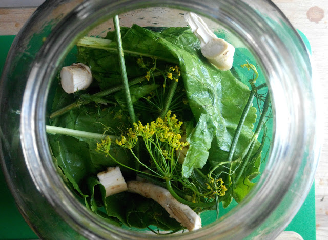 2,5 kg ogórków (nie za dużych)3-4 łyżki soli6 ząbków czosnkukorzeń chrzanuliście chrzanupęczek kopruwrzątek