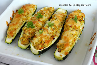 Upał, upał, upał. Przy takiej temperaturze nawet nie mamy ochoty na jedzenie lub wolimy coś lekkostrawnego. Dlatego u mnie dzisiaj przepis na lekkie, ale pożywne danie. Cukinie faszerowane kaszą jaglaną z kurczakiem i warzywami. Musimy niestety trochę czasu spędzić przy piekarniku, ale jeśli zrobimy od razu większą ilość to następnego