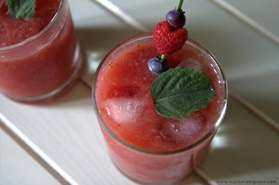 W taki gorący dzień, gdy temperatura wynosi 34 stopnie pragnienie jest ogromne. Bardzo szybko można się odwodnić zatem należy pić dużo płynów. Czy to woda, mrożona herbata czy właśnie lemoniada. Ważne żeby dostarczyć organizmowi wodę i witaminy. W ogródku na krzaku wisiały soczyste, jędrne maliny natomiast w lodówce znalazłam