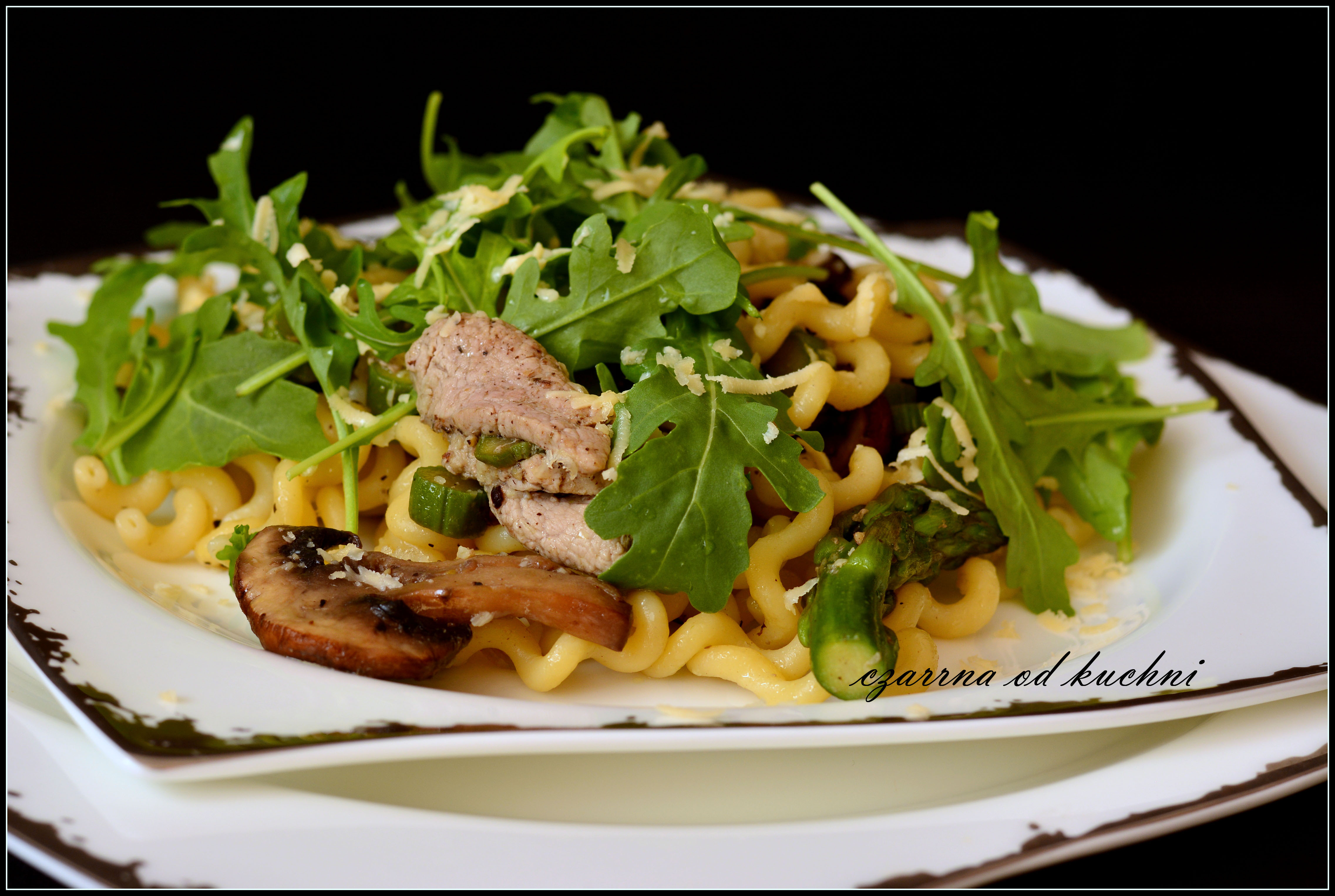 Składniki: 250 g ulubionego makaronu 1 polędwiczka wieprzowa 250 g brązowych pieczarek…