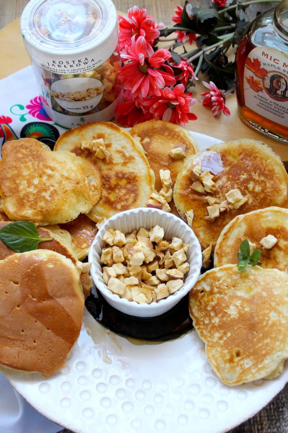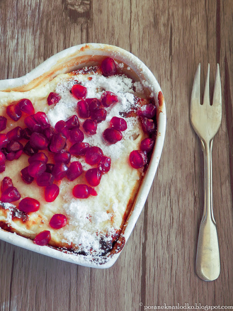 Migdałowy suflet sernikowy z placków Roti nadzianych masłem klonowym, orzechami brazylijskimi i jabłkiempodany z pestkami granatu i cukrem pudrem trzcinowym