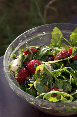 Truskawkowa sałatka z rukolą, ziarnami i miodowo-bazyliowo-miętowym sosem