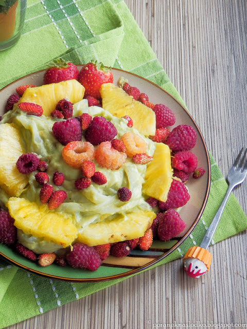 Makaron tagliatelle (Pro4Life) w sosie z awokado, banana i lucumy podany z poziomkami, truskawkami, malinami i ananasem