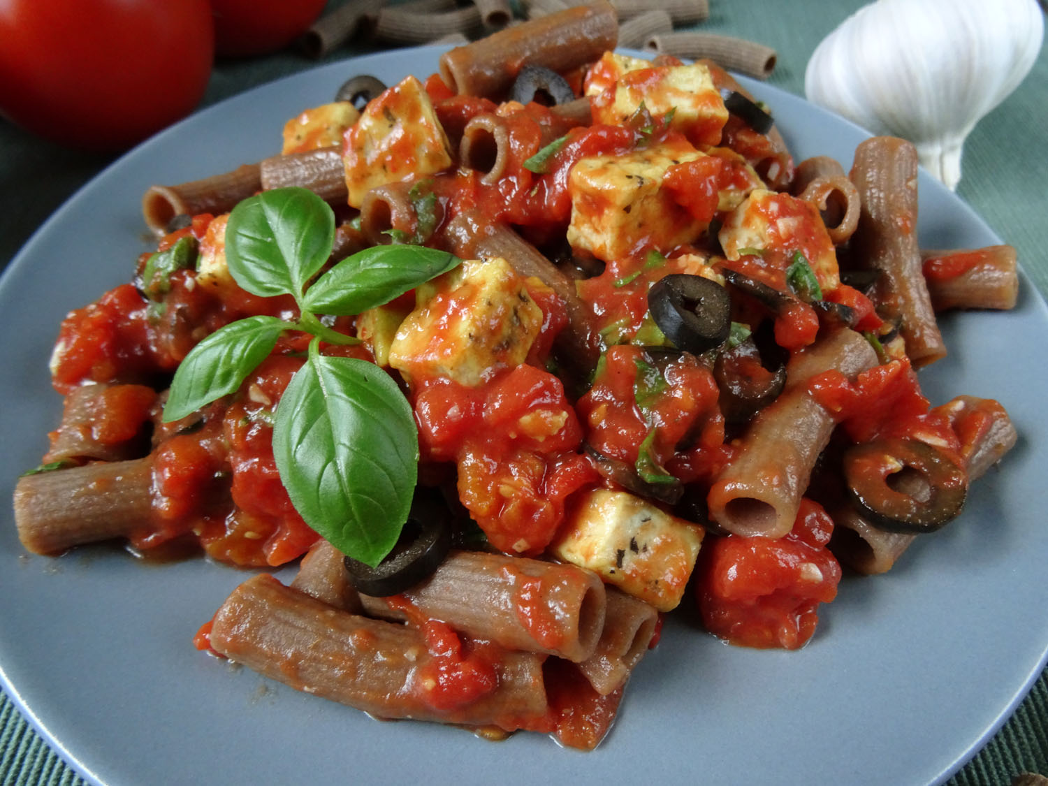 Makaron gryczany z tofu w sosie pomidorowym