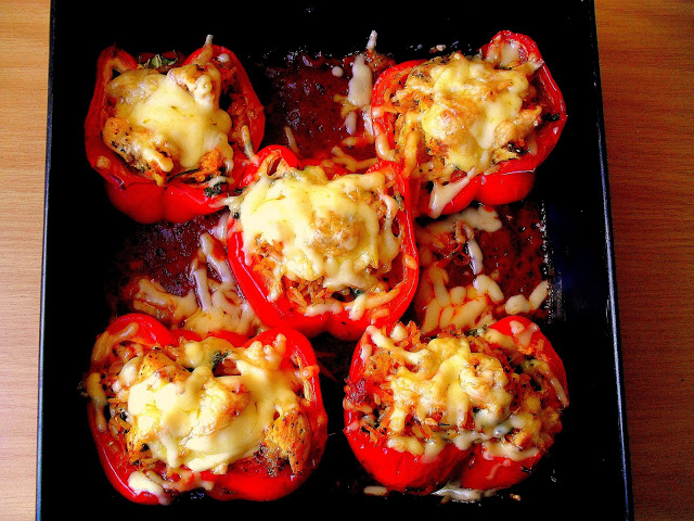 Kiedy na zewnątrz robi się chłodniej, mamy ochotę na zapiekane dania – ostatnio wykorzystałam wciąż trwający sezon na paprykę i nadziałam ją drobiowym mięsem. Bardzo lubię faszerowane warzywa, polecam na przykład moją nadziewaną cukinię – znajdziecie tam również przepis na domowy sos pomidorowy, który wykorzystałam też do papryki (tym