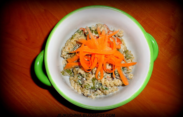 Składniki:250 g ulubionego makaronu,seler naciowy,2 średnie marchewki,kilka pieczarek (u mnie 8),2 łyżki masła,opakowanie mascarpone,sól, pieprz cayenne,oregano,