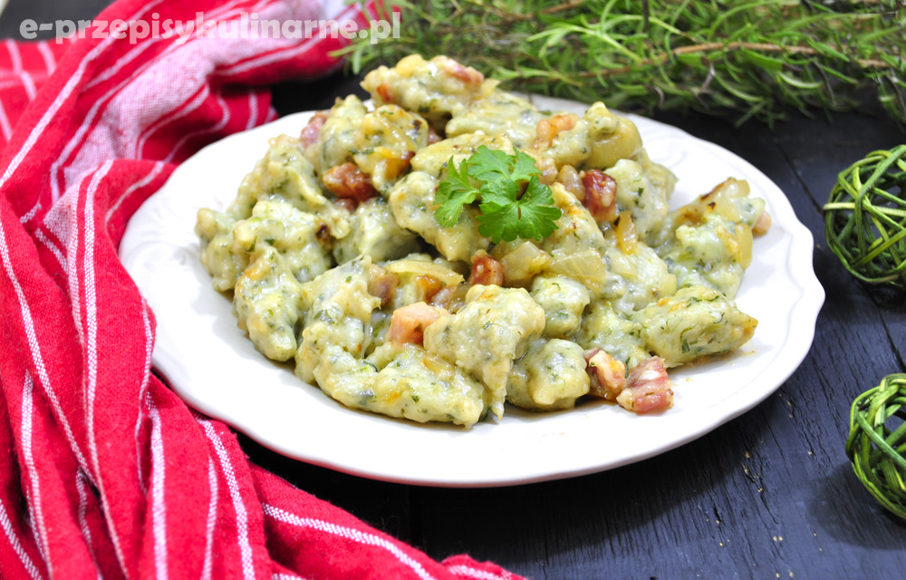 Przepis na pyszne, mięciutkie kluski kładzione z ziemniaków w towarzystwie szpinaku. Choć może nie wyglądają najpiękniej, są bardzo smaczne. Najlepiej smakują okraszone cebulką i skwarkami z boczku.