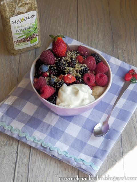 Sezamowy* budyń gryczany z malinami, jeżynami, borówkami, truskawkami, serkiem kokosowym i ekologicznymi nasionami konopi Symbio* zagęszczony mąką sezamową