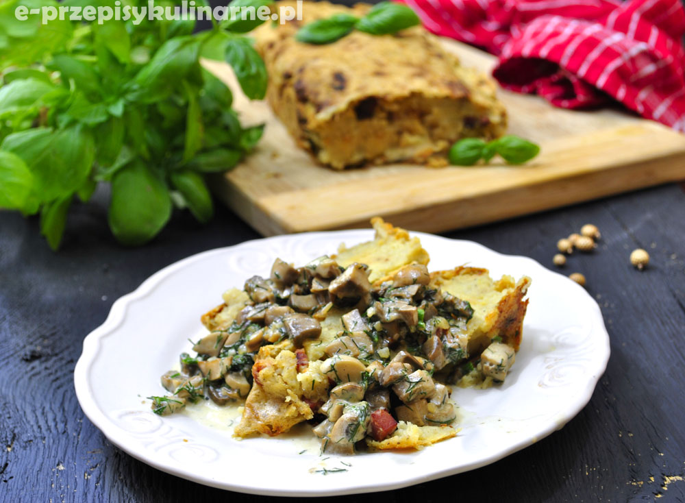 Przepis na babkę ziemniaczaną z gotowanych i surowych ziemniaków podaną z sosem pieczarkowym. Pyszne danie na obiad.