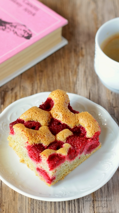 Puszysty, delikatny, słodkawy, pełnoziarnisty biszkopt z kwaskowatymi malinami. Poza sezonem można użyć malin mrożonych, ale raczej w mniejszej ilości. Myślę, że nie będzie przesadą jeśli uznamy, że ciacho jest nie tylko pyszne, ale i zdrowe 😉 Zwłaszcza z ksylitolem zamiast cukru.