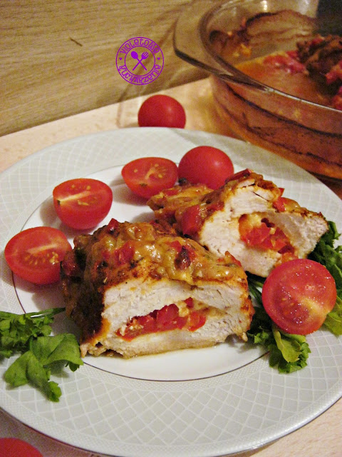 Smaczne fileciki z kurczaka nadziane ciągnącym serem i czerwoną papryką. Rewelacyjne na ciepło do obiadu, jak i pokrojone zimne na kanapki.