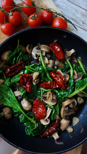 Pieczarki z szpinakiem i suszonymi pomidorami