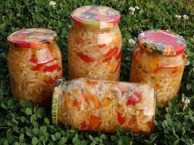 Mam własną kapustkę ale niestety nie mam jej gdzie przechowywać aby przez całą zimę móc robić ze świeżej surówki. Dlatego też kapustkę zamykam wraz z innymi warzywkami w słoiczkach. Dzięki temu potem mam gotową surówkę do obiadu.