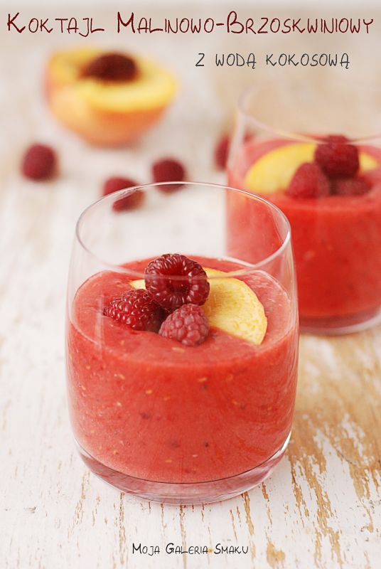Brzoskwinie pozbawić pestek. Pokroić na kawałki. Do blendera wlać wodę kokosową, dodać maliny, brzoskwinie, chia, siemię oraz miód. Zmiksować.