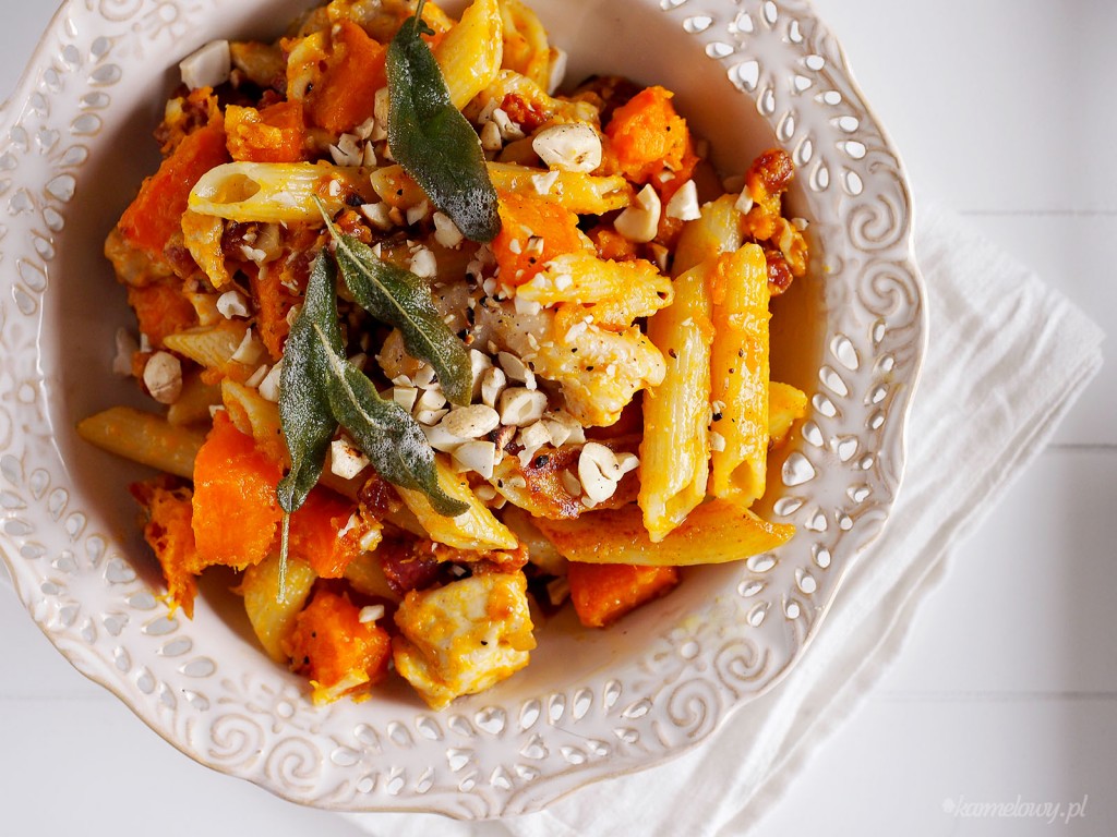 Dziś przedstawiam rewelacyjny przepis na bardzo jesienne danie, które świetnie sprawdzi się jako propozycja obiadowa dla całej rodziny. Ulubiony makaron z kurczakiem i dynią w śmietankowym sosie z palonego masła, podany z parmezanem i uprażonymi orzechami nerkowca. Dorzuciłam jeszcze