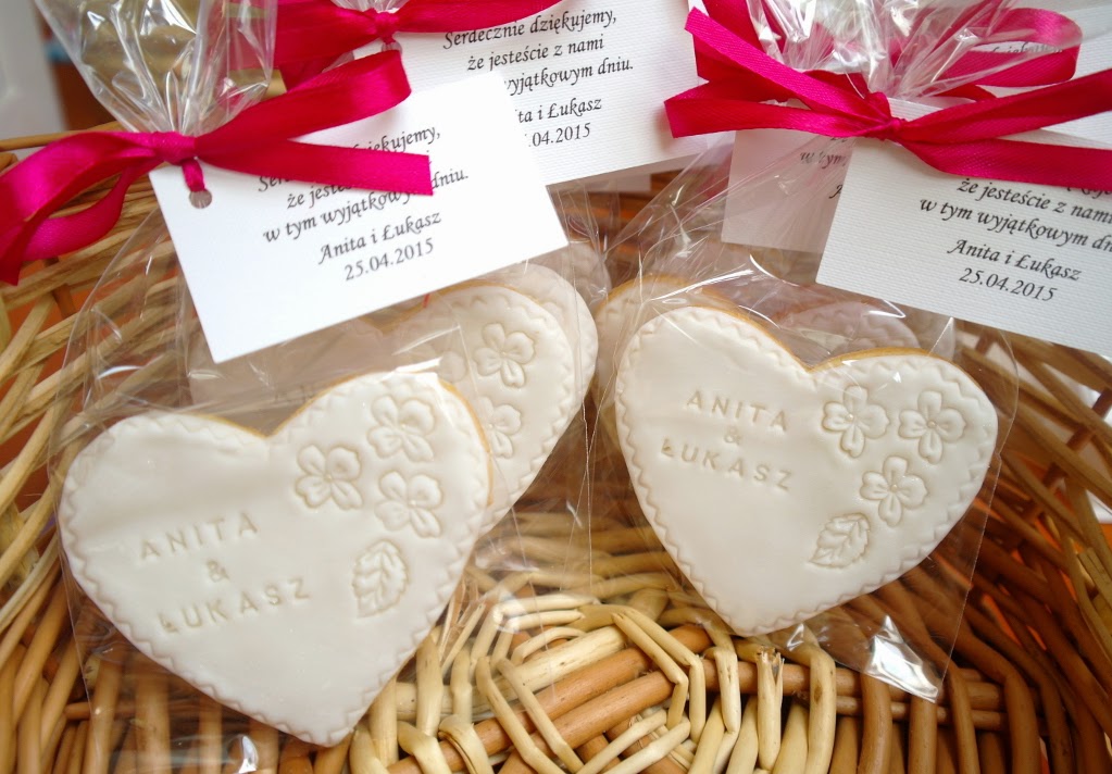 Białe serca przygotowałam na uroczystość zaślubin Anity i Łukasza.Amarantowa wstążka przełamuje biel…