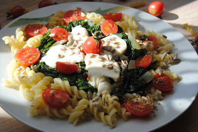 Smaczne, proste i szybkie w wykonaniu. Makaron się gotuje, szpinak lekko dusi, my w tym czasie kroimy pomidorki i ser – i w
