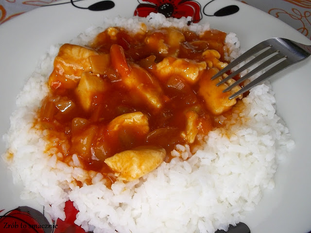 Soczyste kawałki piersi z kurczaka, którym towarzyszą warzywa i pyszny kwaśno- słodki…