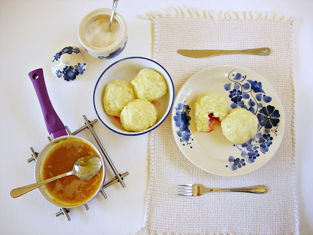Knedle serowe z owocami czyli nazywane przez nas „pufki” to jeden z najlepszych smaków dzieciństwa. Mama robiła i robi je doskonale. Ja dopiero doskonalę tą sztukę i wychodzi mi coraz lepiej. Są pyszne, mięciutkie i rozpływające się w ustach. Sekretem jest użycie samych żółtek gdyż białka powodują twardość tej