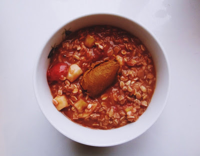 owsianka z mlekiem kokosowym,cynamonem, gałką muszkatołową, truskawkami, jabłkiem i masłem orzechowymporridge with coconut milk, cinnamon, nutmeg, strawberries, apple and peanut butter