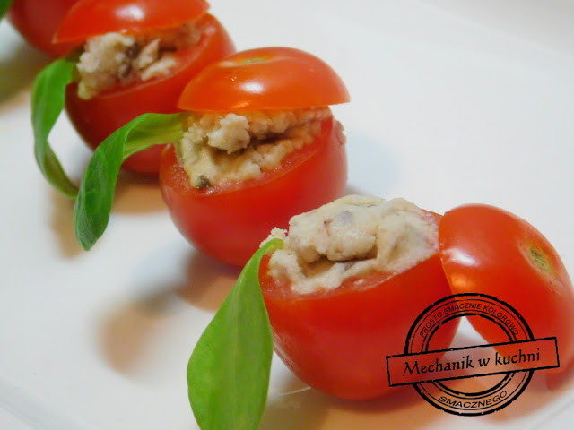 30 pomidorków koktajlowych130 gr sera koziego50 gr anchois (opakowanie)roszponkaPrzygotowanie :Fileciki z anchois odsączyć z