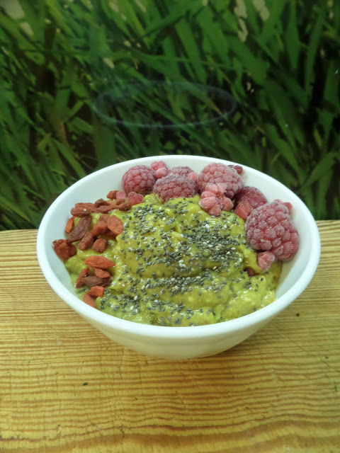 kokosowa surowa gryczanka mango-awokado, podana z nasionami chia, malinami i jagodami goji