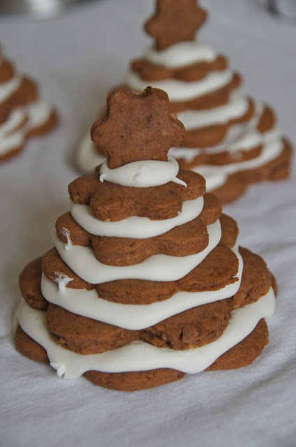 Wspaniała, jadalna dekoracja świątecznego stołu. Piernikowe choinki pięknie się prezentują i wybornie smakują. Zapakowane w ozdobnym woreczku będą doskonałym prezentem bożonarodzeniowym. Jeśli choinki miałyby Wam posłużyć tylko jako dekoracja, to polecam podwoić składniki na lukier. Ładnie wyglądają, gdy lukru jest dużo i gdy wypływa on spomiędzy pierniczków 🙂
