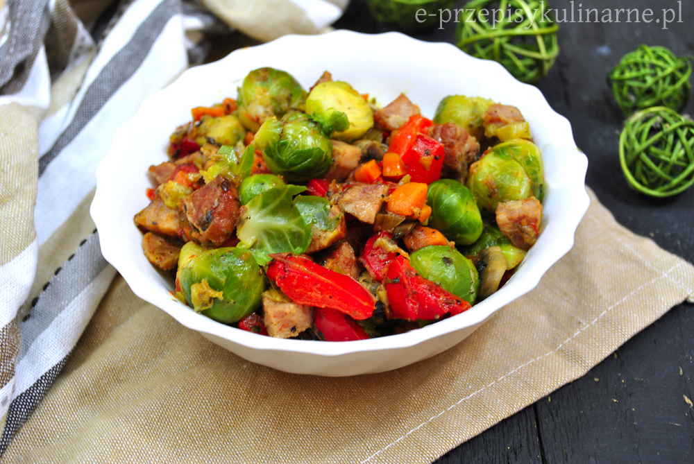 Brukselkę gotujemy w osolonej wodzie do miękkości. Odcedzamy na durszlaku. Kiełbasę i pora kroimy w kostkę, podsmażamy na patelni. Po chwili dodajemy pokrojoną w kostkę